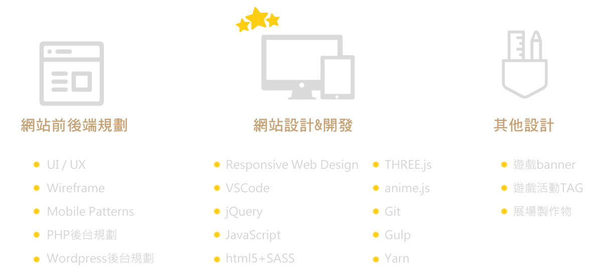 職位:網站設計&規劃、網站前端工程師、專案行銷主策劃。